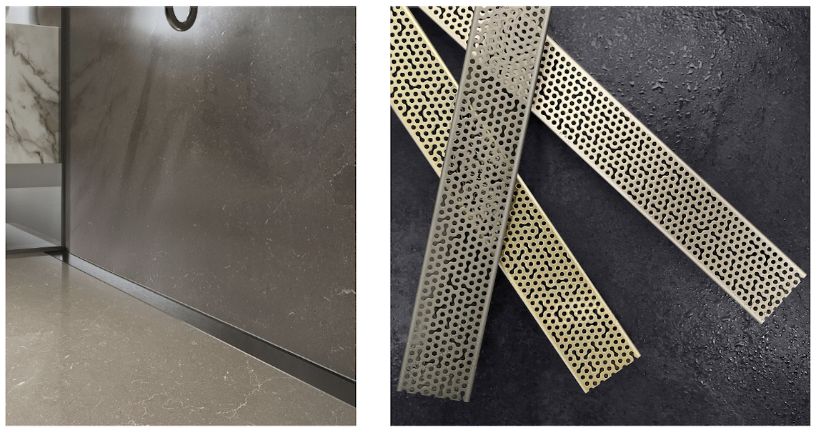 - Adhesion Linear Drain: The Adhesion Linear Drain was designed in collaboration with the Gensler design team and inspired by the science of adhesion. To develop an abstract visual, Gensler observed how water droplets moved and gathered after being poured onto a variety of luxury surfaces. Adhesion Linear Drain has evolved into a modern design where irregularity was encouraged to create a random and precise pattern.